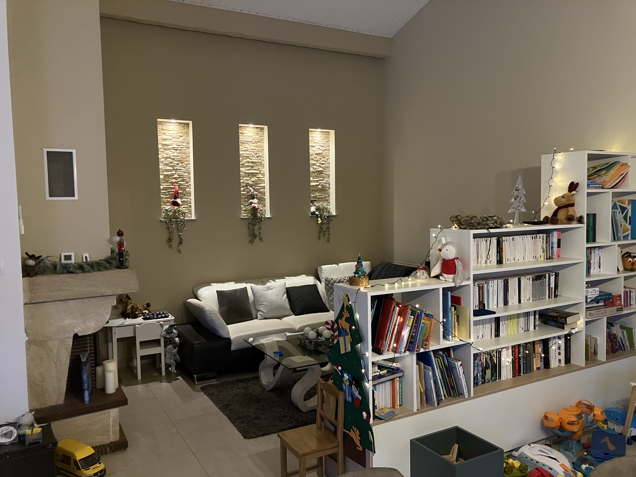Objectifs du projet : habiller le mur principal bénéficiant d’une belle hauteur sous-plafond, créer une bibliothèque originale.