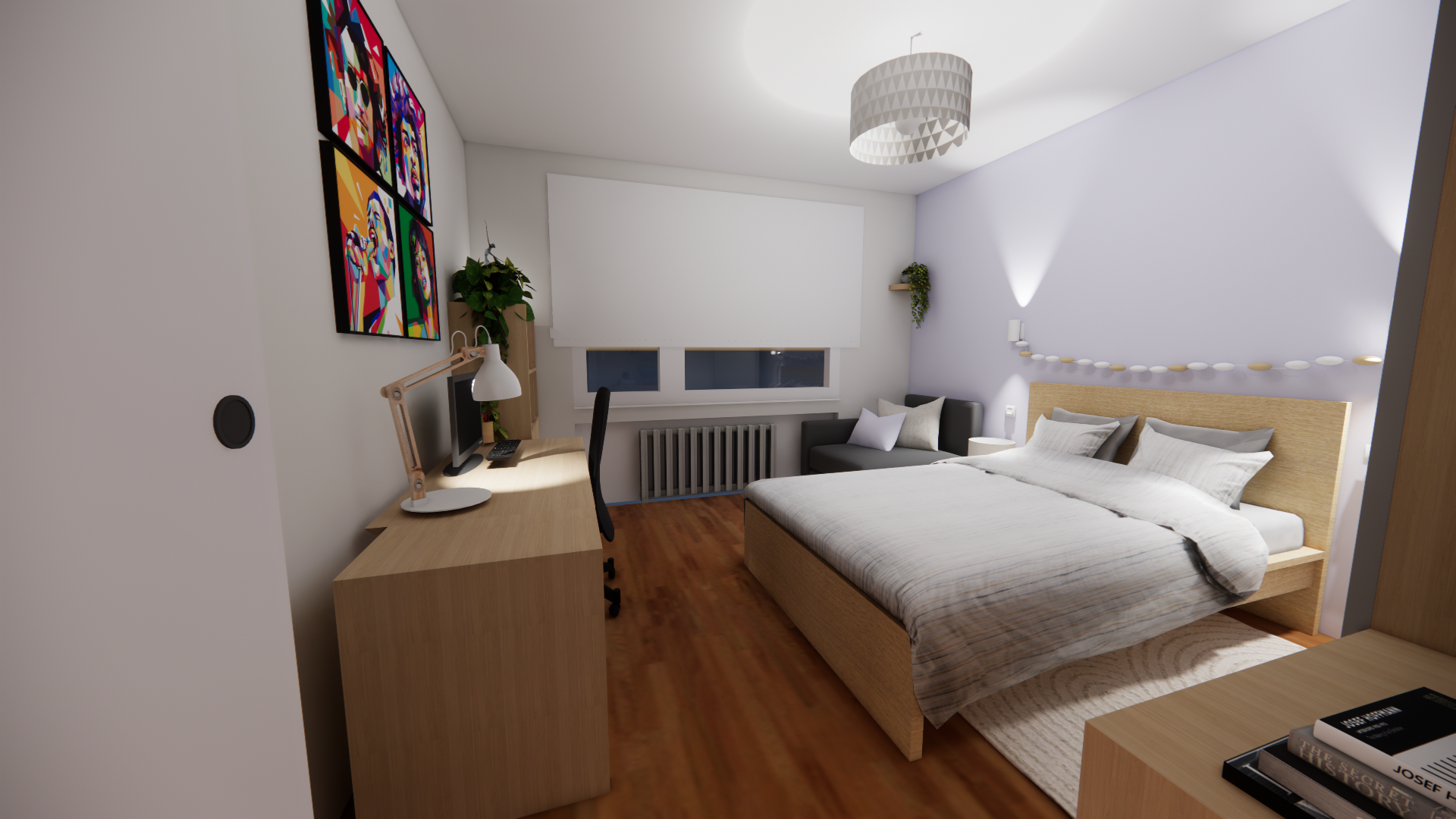 Objectifs du projet: intégrer un lit double, intégrer une grande armoire, optimiser l’espace de travail et garder un coin détente et lecture.